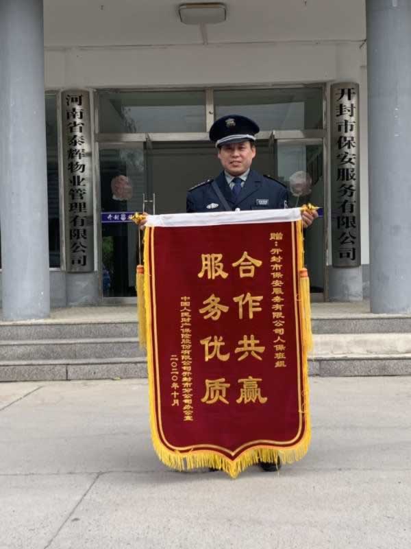 2020年10月26日上午,人保財(cái)險(xiǎn)公司辦公室一行3人為開(kāi)封市保安服務(wù)有限公司送來(lái)一面上書“合作共贏,**服務(wù)”的錦旗,對(duì)公司保安一部駐人保財(cái)險(xiǎn)班組的工作給予了充分的肯定,對(duì)班組隊(duì)員積極認(rèn)真的工作作風(fēng),熱情周到的服務(wù)提出了表?yè)P(yáng)。